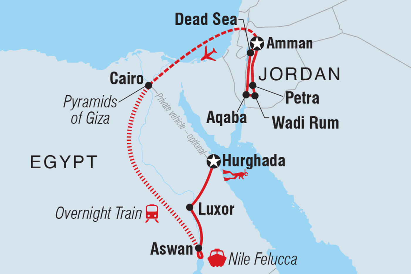 - Ägypten und Jordanien erfordern ein gewisses Maß an Bescheidenheit in Bezug auf die Kleidung, obwohl am Strand die übliche Badekleidung akzeptabel ist.