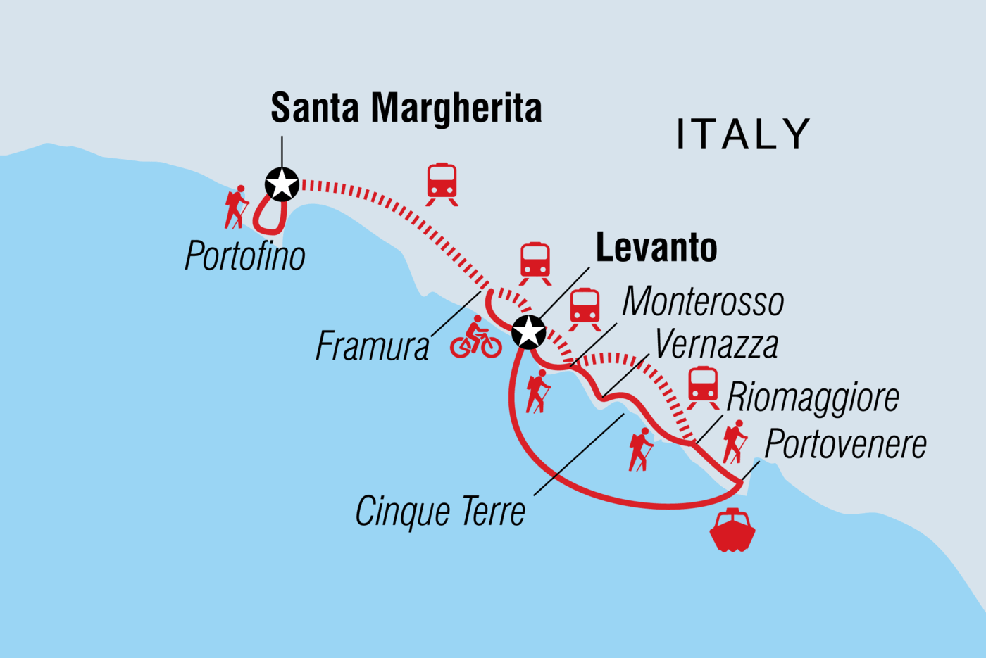 - Bitte beachte, dass Erdrutsche in letzter Zeit viele Wege entlang der Küstenroute der Cinque Terre zerstört haben. Da in einigen Gebieten Instandsetzungsarbeiten durchgeführt werden, können sich die täglichen Wanderungen ändern und werden manchmal durch Wanderungen mit einem höheren Schwierigkeitsgrad ersetzt. Dein Reiseleiter wird dich auf dem Laufenden halten und dir alternative Wanderungen anbieten