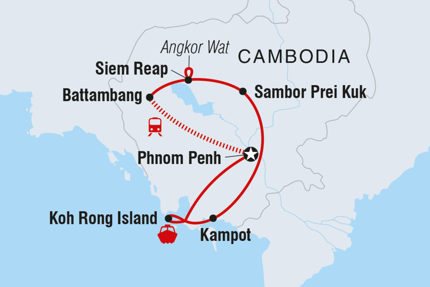 - Genieße eine ausführliche Tour durch Kambodscha in einem gemütlichen Tempo, gemischt mit aufschlussreichen Führungen durch einheimische Guides, vielen Gelegenheiten, mit den Einheimischen auf Tuchfühlung zu gehen und freier Zeit, um dein Abenteuer individuell zu gestalten.