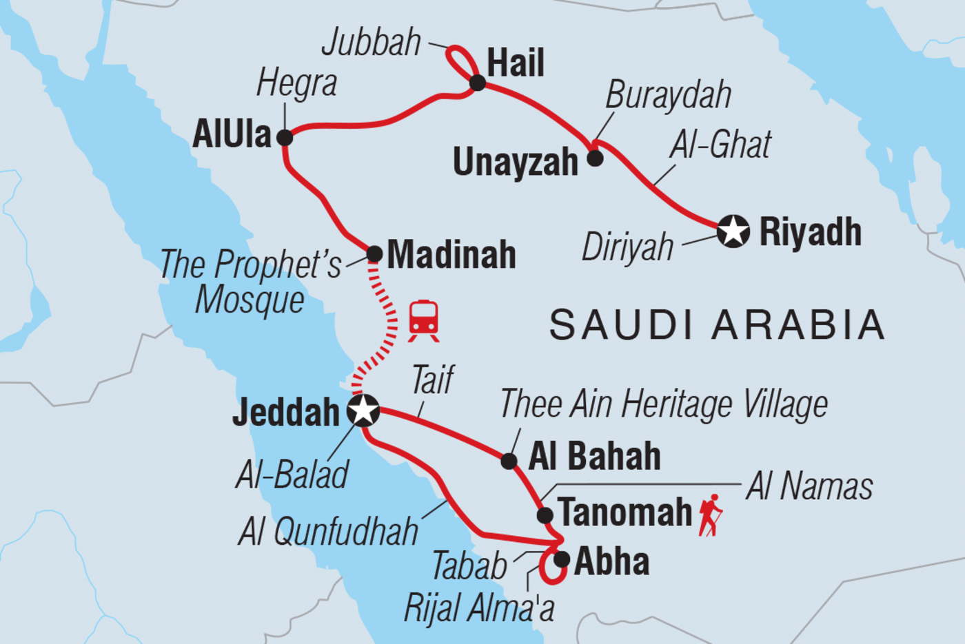 - Saudi-Arabien ist ein großes Land, und du wirst auf dieser actionreichen, aber kurzen Reise viel erleben. Mach dich auf einige lange Reisetage gefasst, an denen es nur wenige Essenspausen geben wird