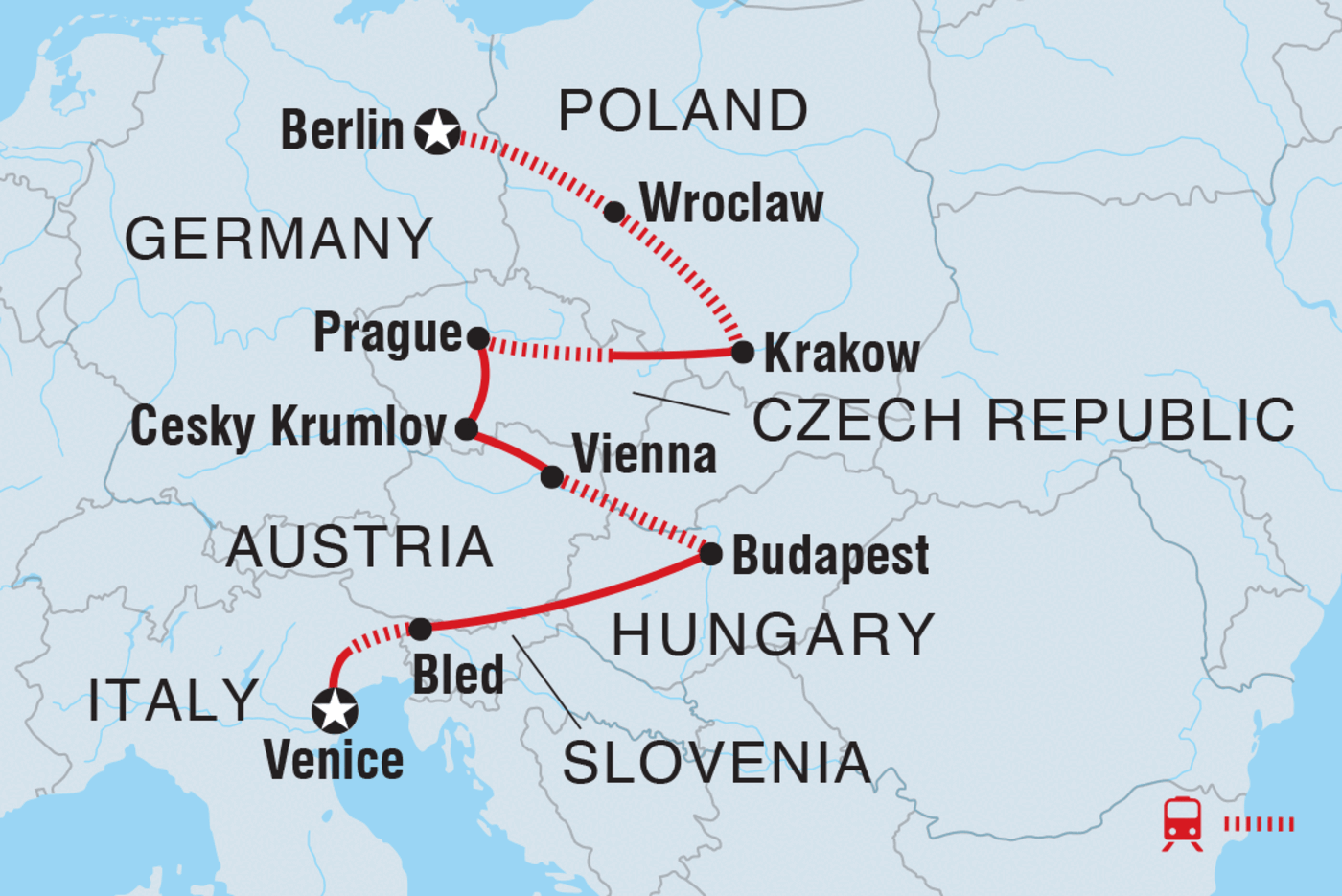 Diese 15-tägige Reise beginnt in Deutschland und endet in Italien und führt dich durch sage und schreibe sieben Länder. Gemeinsam mit anderen Alleinreisenden erlebst du historische Sehenswürdigkeiten, mittelalterliche Plätze, Burgen auf Hügeln, romantische Kanäle und ein pulsierendes Nachtleben, während du mit neuen Freunden Erinnerungen für ein ganzes Leben sammelst. Du beginnst in Berlin, der alten Hauptstadt Europas, wanderst auf dem Königsweg in Krakau, genießt die Terrakotta-Ansichten von Prag und Cesky Krumlov, lässt dich vom malerischen Bleder See verzaubern und landest schließlich in den postkartenreifen Kanälen von Venedig. Entdecke mit deinem Reiseleiter die Geheimnisse der Region, erkunde sie in deinem eigenen Tempo und nutze alle optionalen Aktivitäten, die du unternehmen möchtest. Und das Beste daran? Du wirst das alles mit gleichgesinnten jungen Reisenden machen, die Mitteleuropa auf die gleiche Weise bereisen wollen.