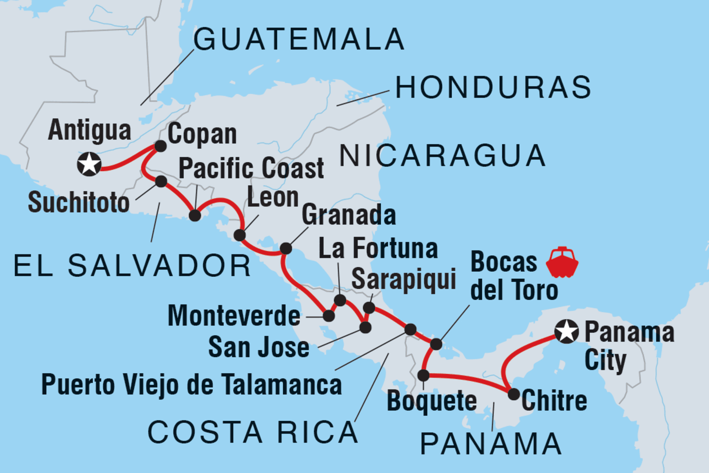 Mach dich bereit für ein 28-tägiges Abenteuer durch Guatemala, Honduras, El Salvador, Nicaragua, Costa Rica und Panama. Von Ozeanen voller Meereslebewesen bis hin zu tropischen Wäldern mit Dschungelmelodien ist dieser Teil Mittelamerikas ein wahres Naturparadies. Du erkundest die kunstvoll geschnitzten Bauwerke von Copan, die Nebelwälder von Monteverde und verbringst drei Nächte im Inselparadies von Bocas del Toro. Unterwegs probierst du bei Kochkursen mit Einheimischen die verschiedensten Küchen und bekommst so einen echten Einblick in das Herz und die Seele Mittelamerikas.