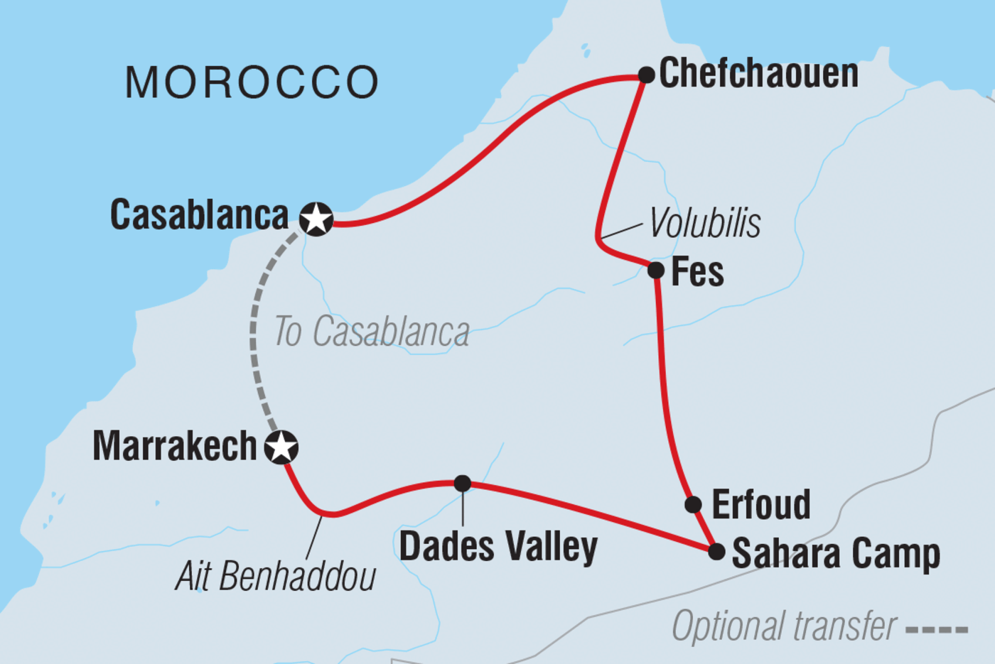 Da für heute keine weiteren Aktivitäten geplant sind, geht dein Abenteuer nach dem Frühstück zu Ende. Ein Transfer zum Flughafen von Marrakesch wird organisiert. Wenn du deinen Aufenthalt in Marrakesch verlängern möchtest, was wir dir wärmstens empfehlen, sprich einfach im Voraus mit deiner Buchungsstelle, um eine zusätzliche Unterkunft zu organisieren.