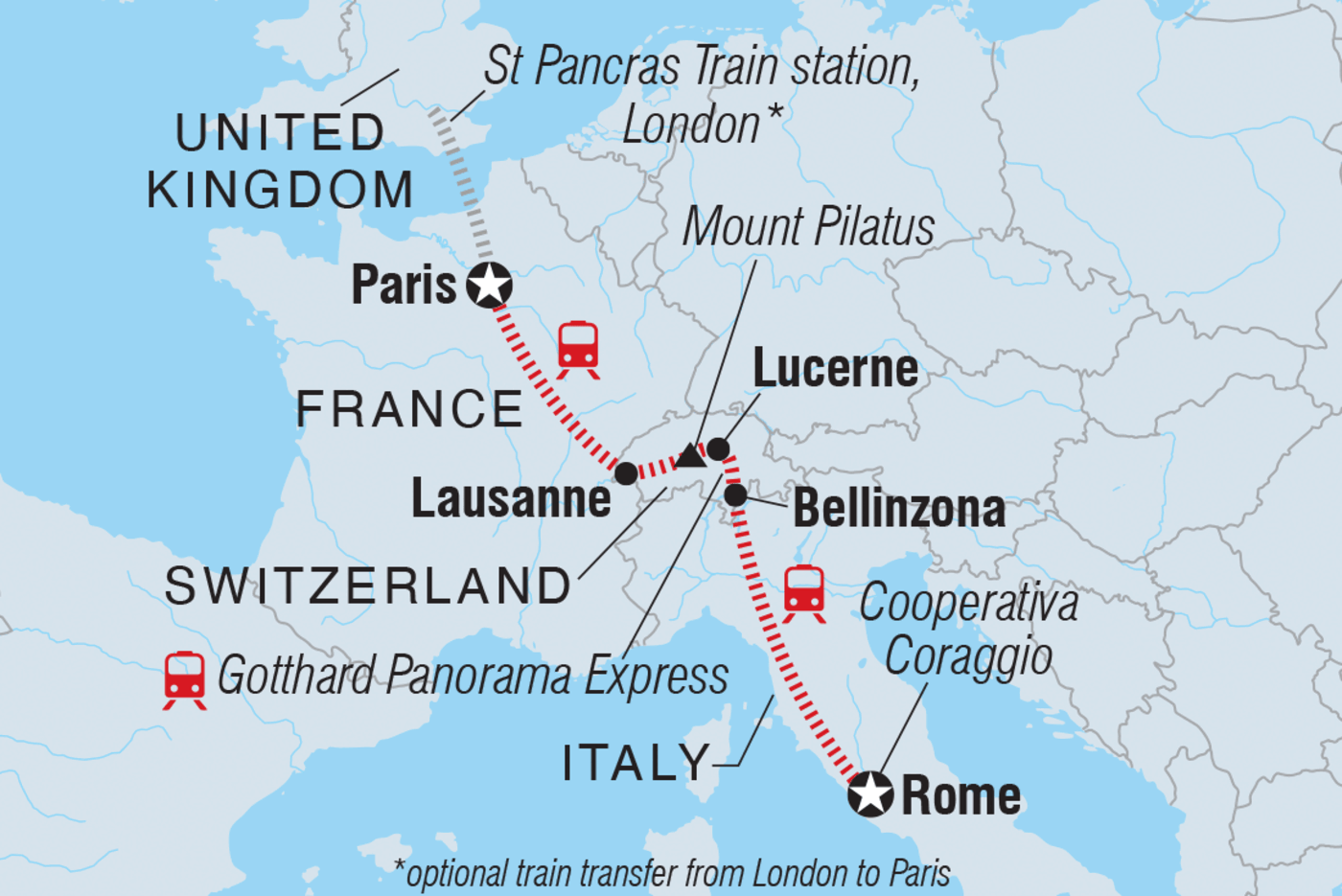 Wenn du von oder durch das Vereinigte Königreich reist, kannst du deine Reise optional mit einer Zugfahrt von London nach Paris beginnen. Das macht deine Reise zu einem epischen Abenteuer ohne Flug. Sprich mit deiner Buchungsstelle, um mehr darüber zu erfahren.