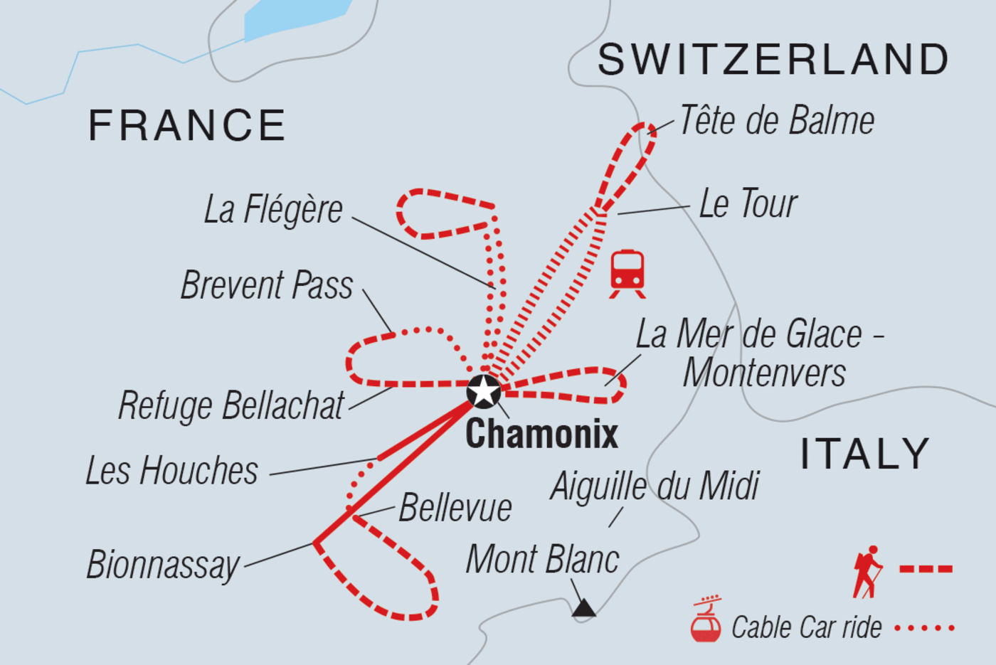 Wenn du auf der Suche nach unvergesslichen Alpenblicken, lohnenden Wanderungen und einem fantastischen Ort bist, an dem du jeden Abend deinen Kopf ausruhen kannst, bist du hier genau richtig. Begib dich auf ein achttägiges Wanderabenteuer durch die Alpen, bei dem du jeden Tag die weißen Landschaften zu Fuß erkundest, bevor du zu deiner Basis in Chamonix zurückkehrst. Da an einigen Tagen Seilbahnfahrten inbegriffen sind, hast du mehr Zeit für Erkundungen und weniger Zeit für anstrengende Kletterpartien - und mit einem internationalen Bergführer, der dich begleitet, kannst du darauf vertrauen, dass du in sicheren Händen bist.