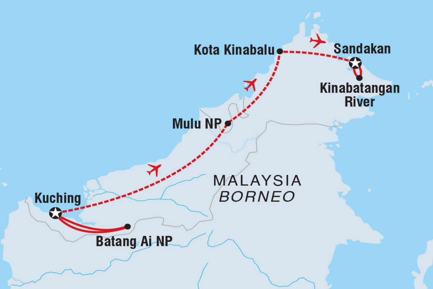 Auf einer 12-tägigen Premium-Reise durch Regenwald, Dschungel, Flüsse und Feuchtgebiete entdeckst du die Naturwunder Borneos. Auf deiner Reise durch den Dschungel von Sabah und Sarawak entdeckst du faszinierende Kultur, Geschichte und uralte Traditionen. Du lernst die Lebensweise der Iban im Batang Ai Nationalpark kennen, lässt dich von der Energie Kuchings mitreißen und kommst am Kinabatangan River mit der Natur in Kontakt. Mache eine Bootsfahrt auf der Suche nach einheimischen Wildtieren, besuche ein Orang-Utan-Rehabilitationszentrum in Sandakan und wache mit den Rufen der Affen auf. Von dichten Regenwäldern über neblige Flüsse bis hin zu Dschungeltälern - diese vielfältige Insel ist eine wahre Freude zu erkunden.