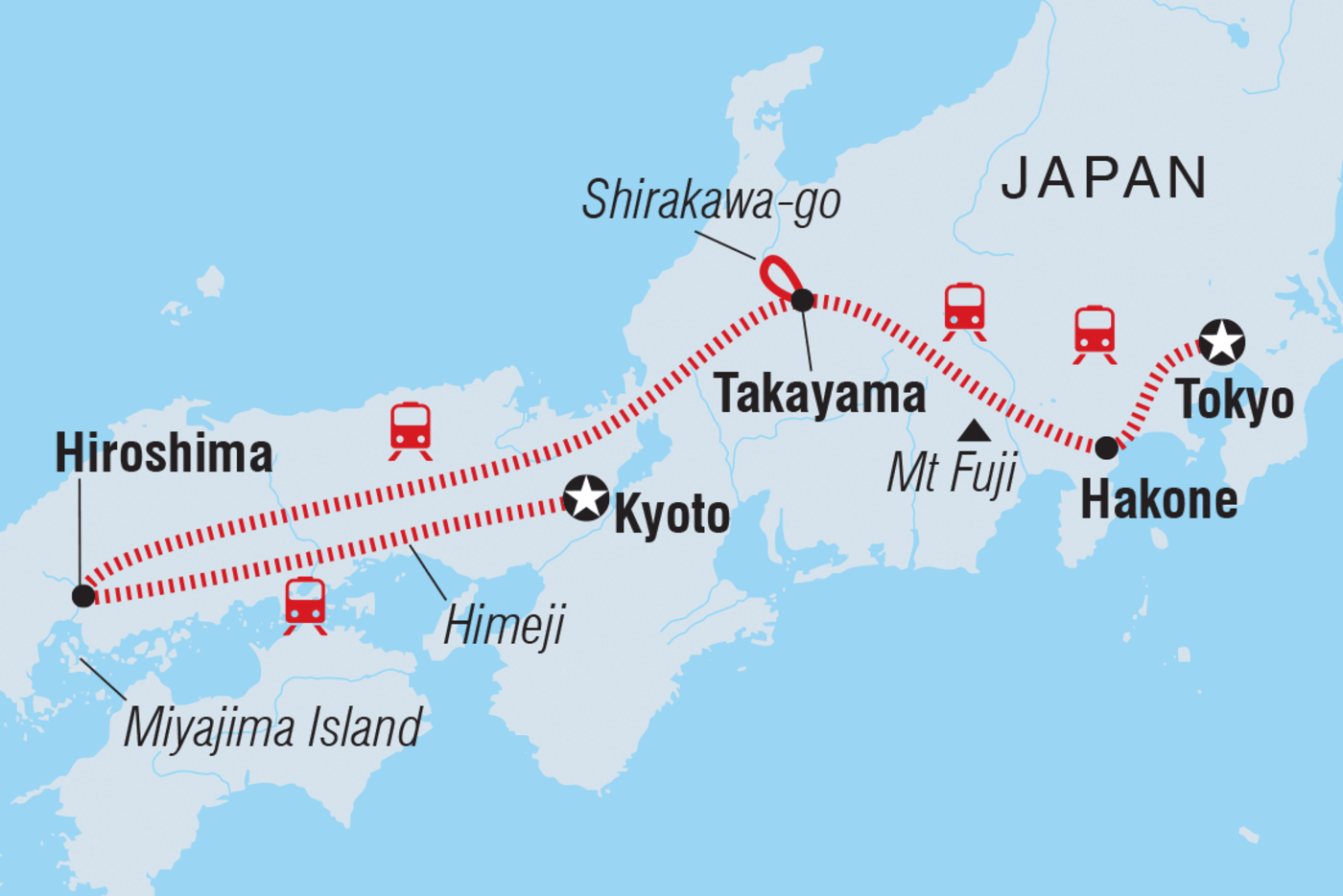 - Sauge Japans Naturschönheiten auf - mit Aufenthalten im bergigen Hakone, Blicken auf den Mt. Fuji, einem Spaziergang um die atemberaubende Insel Miyajima und dem Blick auf die japanischen Alpen im alten Dorf Shirakawa-go.