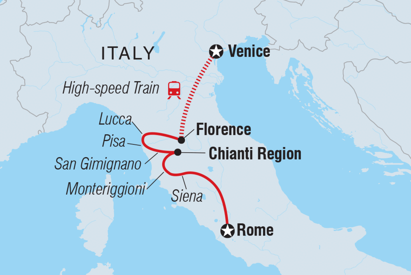Entdecke die Wärme und den Reichtum der italienischen Kultur auf deiner achttägigen Premium-Reise von Rom nach Venedig. Reise durch das rustikale Herz der Toskana und entdecke kulinarische Köstlichkeiten und versteckte Schätze in der hügeligen Landschaft. Entdecke die Wunder des Markusplatzes in Venedig, des Schiefen Turms in Pisa und des Kolosseums in Rom - eines der sieben Weltwunder - mit einem erfahrenen örtlichen Reiseleiter. Von antiken Monumenten und lebhaften Städten bis hin zu weitläufigen Weinbergen und traditioneller toskanischer Küche - dieses Abenteuer wird sowohl für Italien-Neulinge als auch für Italien-Kenner unvergessliche Momente bereithalten.