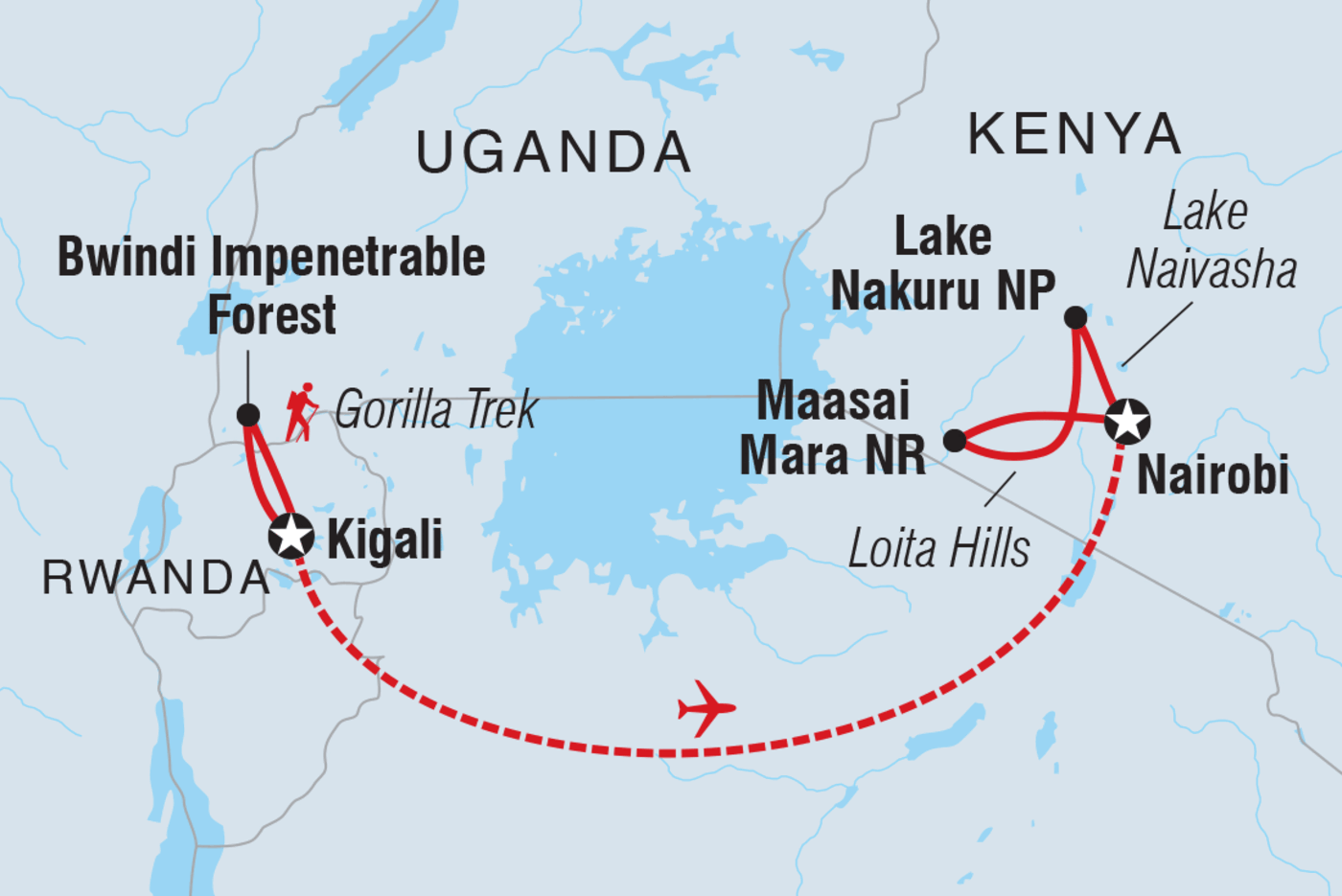 Wilde Träume werden wahr auf einer 13-tägigen Premiumreise durch Uganda, Ruanda und Kenia. Tauche ein in die Welt der seltenen Berggorillas in Ugandas Bwindi Impenetrable Forest und verbringe einen Tag damit, diese liebenswerten Tiere zu beobachten. Sieh dir die düsteren Erinnerungen an Kigalis verheerende Vergangenheit an, beobachte das Leben der Einheimischen auf den Straßen und erlebe ein wunderschönes Land, das sich ständig bemüht, vorwärts zu kommen. Erkunde die weiten Ebenen der Maasai Mara mit dem Komfort eines Landcruisers mit Allradantrieb, mit einem erfahrenen lokalen Führer am Steuer, triff Maasai-Krieger und lerne ihre Lebensweise kennen. Diese unvergessliche Reise wird dir sicher für immer in Erinnerung bleiben.