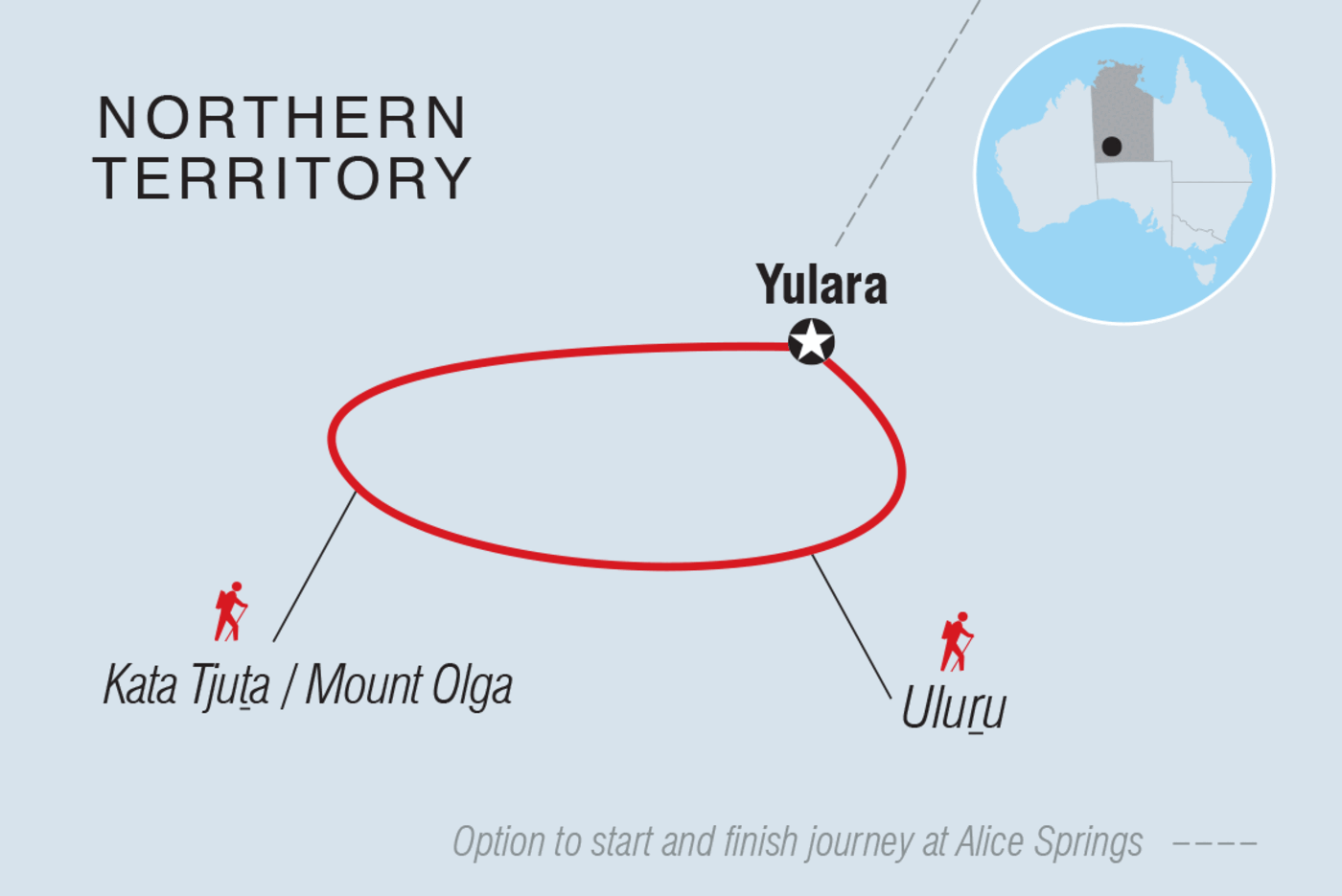 Du hast die Möglichkeit, deine Reise entweder im Yulara Resort (Ankunft um ca. 10.30 Uhr), am Ayers Rock Airport (Ankunft um ca. 12 Uhr) oder zurück in Alice Springs (Ankunft um ca. 17.30 Uhr) zu beenden. Wenn dein Flug von Yulara (Ayers Rock Airport) vor 13 Uhr abfliegt, musst du die heutigen Aktivitäten verpassen und dich selbst mit dem Shuttlebus des Resorts zum Flughafen begeben.