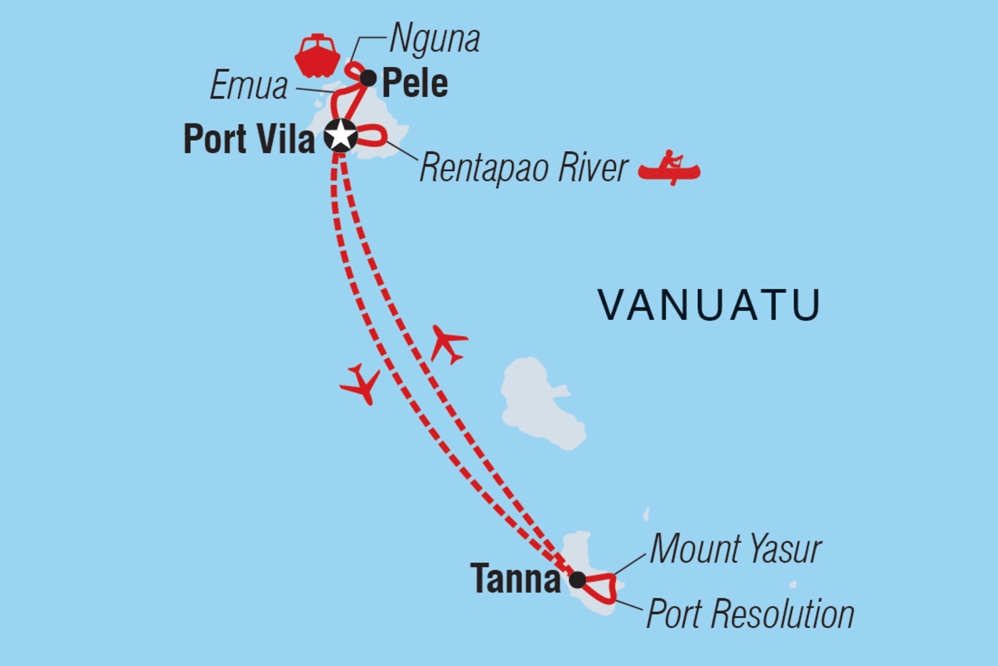 Auf dieser achttägigen Expedition erlebst du die raue Schönheit und Kultur der winzigen Inseln von Vanuatu. Lass die Resorts von Port Vila hinter dir und fliege zu den regenwaldreichen Inseln, wo du Einheimische treffen, in die Natur eintauchen und echte Abenteuerreisen erleben kannst. Lerne Gemeinden kennen, in denen noch Kastom - die traditionelle Kultur und das Gesetz - herrscht, darunter die legendären John Frum Dörfer. Schnorchle zwischen den wunderschönen Korallenriffen, die gesetzlich geschützt sind. Wandere durch hoch aufragendes Grün und erfahre, wie es ist, inmitten aktiver Vulkane und tropischer Wildnis zu leben. Lerne eine Seite von Vanuatu kennen, die nur wenige Touristen besuchen, die aber diejenigen, die sie besuchen, nie vergessen werden.