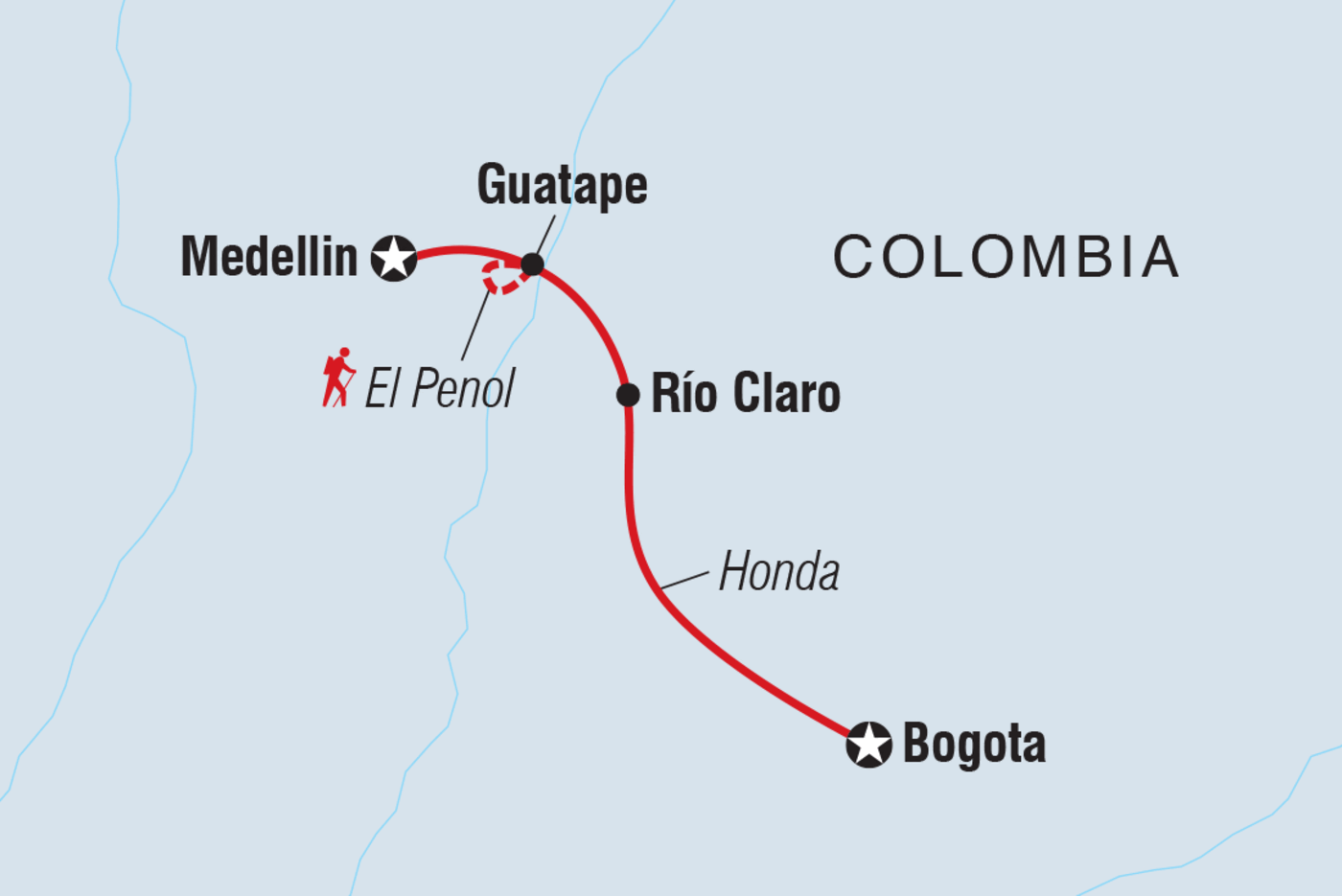 Dieses siebentägige Abenteuer von Bogota nach Medellin ist perfekt für alle, die die Naturschönheiten Kolumbiens kennenlernen möchten. Es gibt geplante Aktivitäten und viel Zeit, um in deinem eigenen Tempo zu wandern. Wandere auf einem ökologischen Pfad, schwimme in den Flüssen von El Marmol und erklimme die Zickzack-Treppe von El Penol für einen 360-Grad-Blick über Guatape. Besuche die Hauptstadt der bergigen kolumbianischen Provinz Antioquia, Medellin, und spiele Tejo mit den Einheimischen bei einem oder zwei lokalen Bieren. In deiner Freizeit kannst du vielleicht die Stromschnellen des Rio Claro hinunterrasen oder mit deiner Gruppe neuer Freunde die Straßenkunst in der Comuna 13 (San Javier) erkunden!