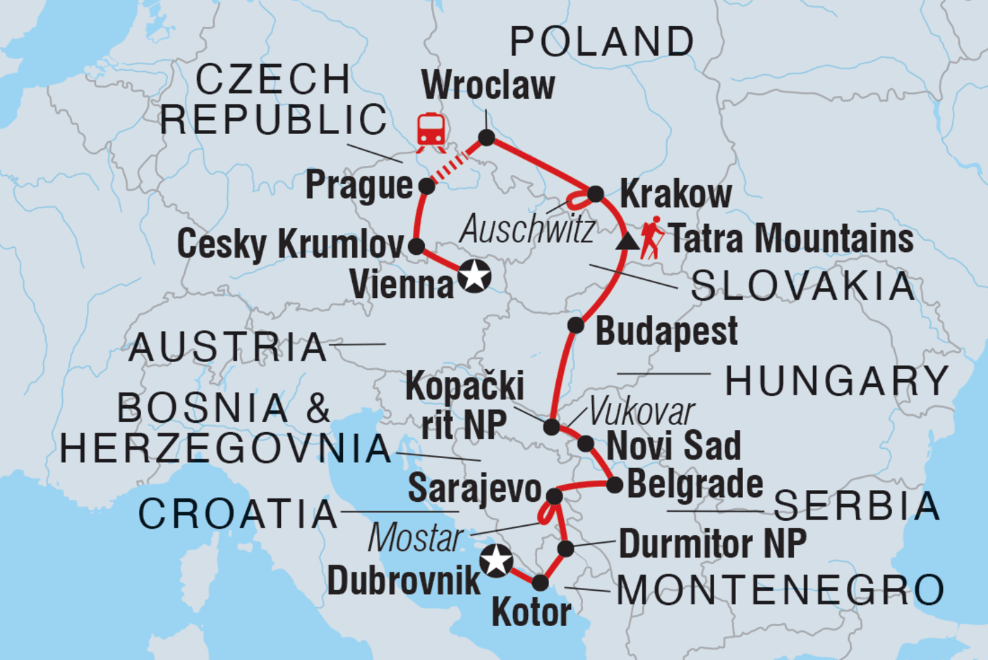 Reise von Wien nach Dubrovnik auf diesem 29-tägigen Abenteuer durch Österreich, die Tschechische Republik, Polen, die Slowakei, Ungarn, Serbien, Bosnien-Herzegowina, Montenegro und Kroatien. Entdecke eine Region, in der die Vergangenheit in Form von Alpenstädten, mittelalterlichen Schlössern und heiligen Klöstern noch immer ihren Zauber ausübt. Besuche den Stephansdom in Wien, wandere durch das Staatliche Museum Auschwitz-Birkenau und erkunde den Durmitor-Nationalpark, der zum UNESCO-Weltkulturerbe gehört. Streife durch das Viertel Zemun, wandere im Tatra-Gebirge und mache einen Tagesausflug nach Mostar. Diese Reise führt dich durch neun Länder und zeigt dir das Beste von Mitteleuropa, während du viel Zeit hast, die Kultur und die Menschen auf deine eigene Weise zu erleben.
